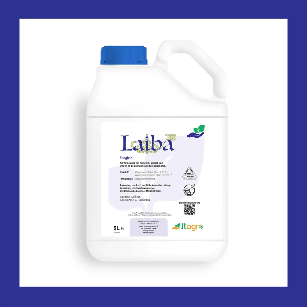 LAIBA ist ein Fungizid, das sowohl systemisch als auch translaminar transportiert wird. Es enthält den Wirkstoff Azoxystrobin, der zur chemischen Gruppe der ß-Methoxyacrylate (Strobilurin-Derivate) gehört. Die Wirkung ist primär protektiv, daher muss der Wirkstoff vor oder bei Beginn eines Befalls angewendet werden. Azoxystrobin wirkt durch es das Enzym Cytochrom-c-Reduktase hemmt und somit die mitochondriale Atmung der schädlichen Pilze blockiert.